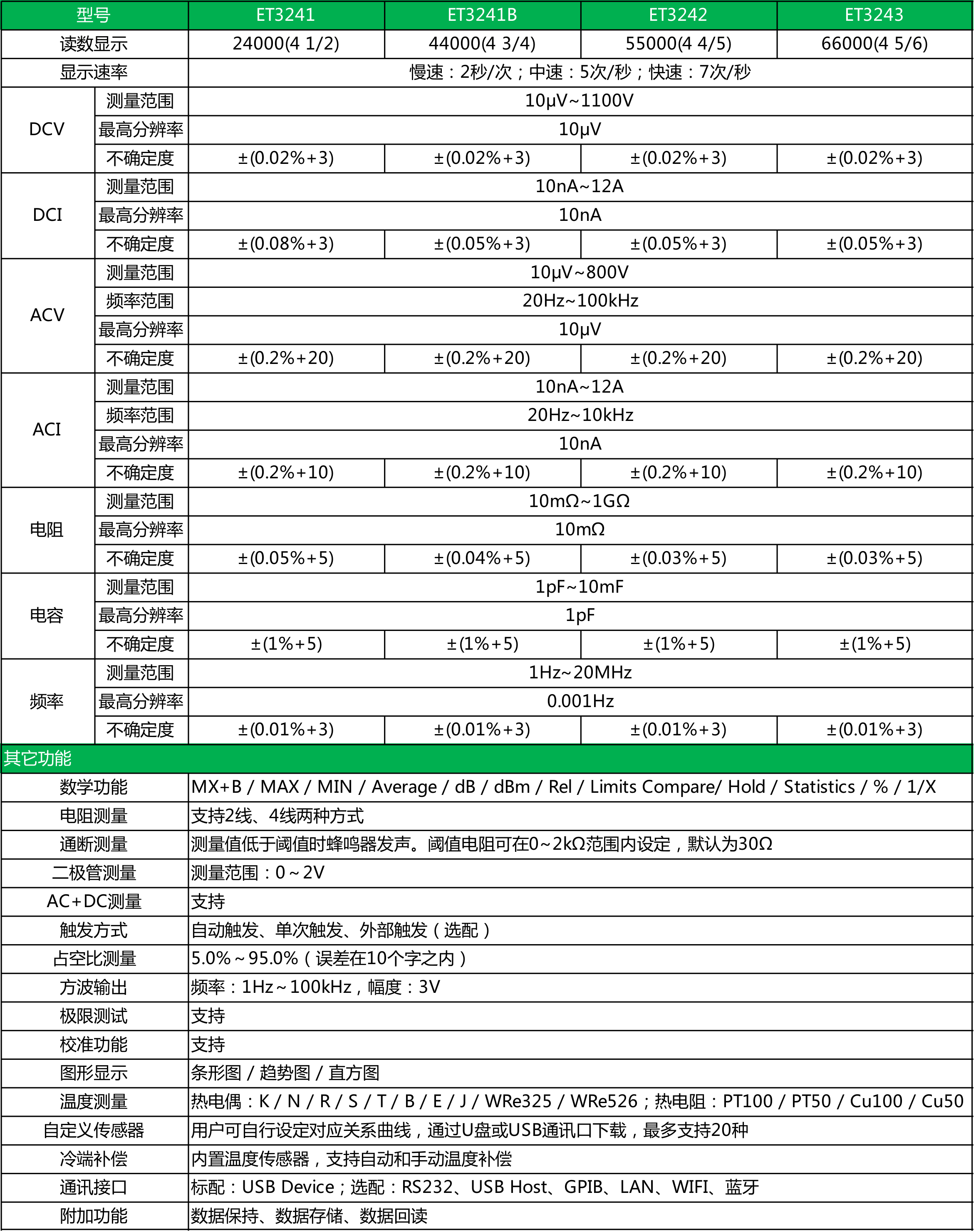 ET324X系列为功能全面、性能稳定的真有效值数字万用表,本系列台式万用表提供强大功能,出色的性能,良好的用户体验;3.5寸TFT液晶屏显示、读数清晰、内容丰富,具有良好的显示效果。本表采用市供电驱动使之成为高可靠性数字台表。全功能、全量程过载保护和独特的外观设计使之成为电工以及高校实验室的首要之选。